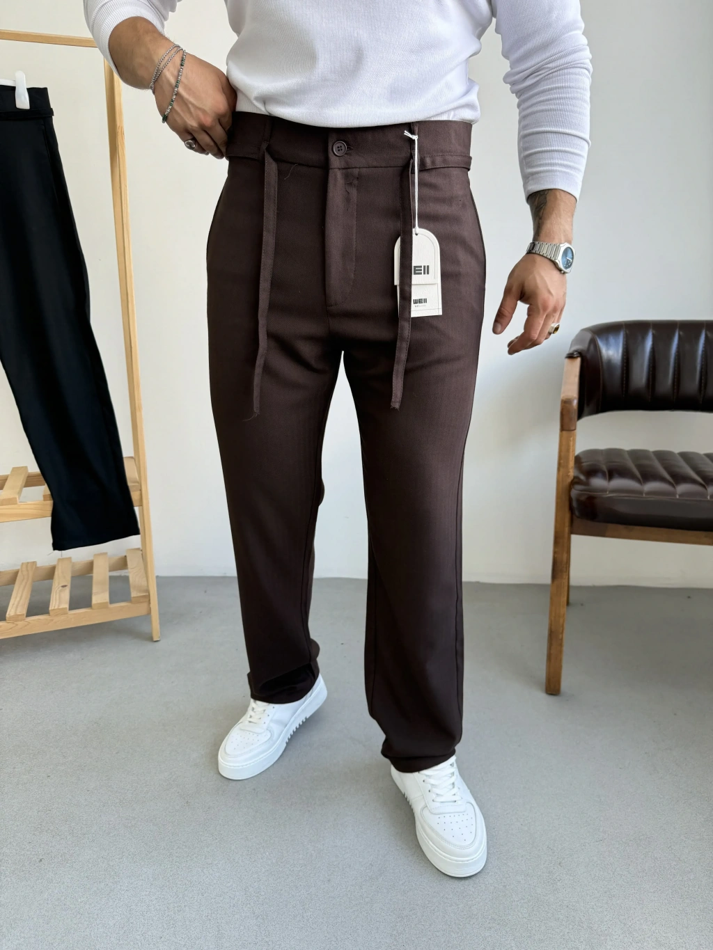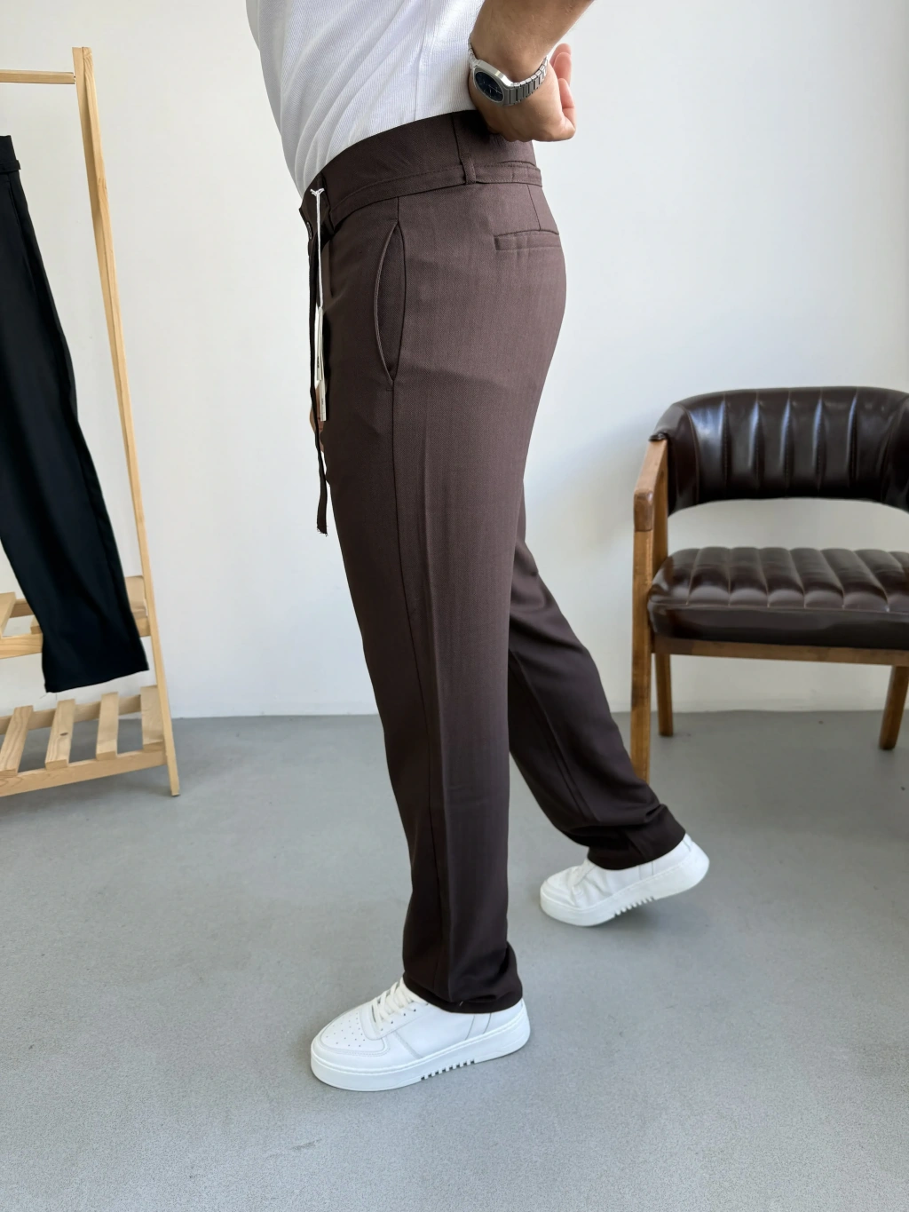 Çizgi Şerit Detaylı Kumaş Pantolon Acı Kahve
