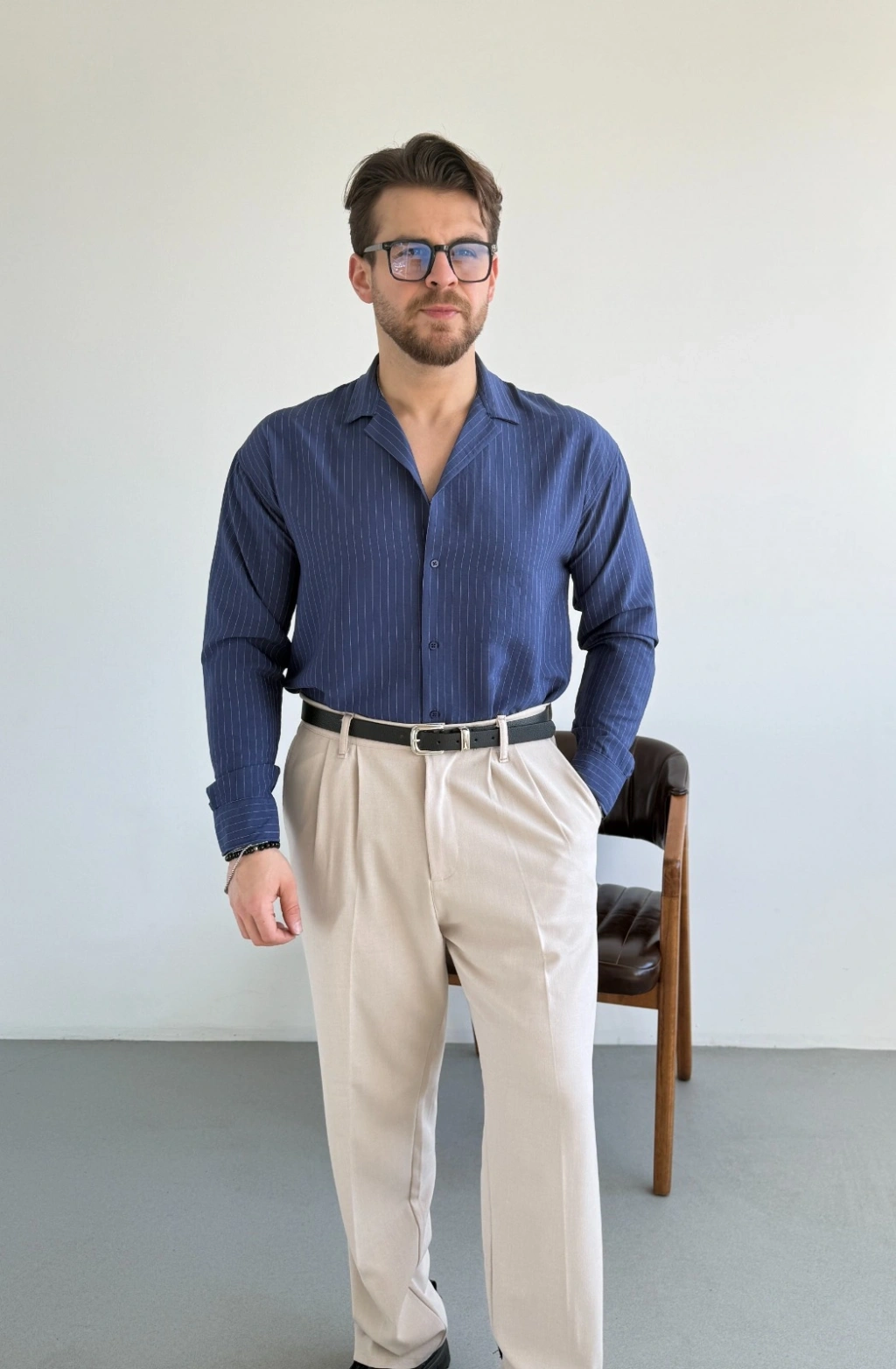 LACİVERT APAŞ YAKA ÇİZGİLİ GÖMLEK