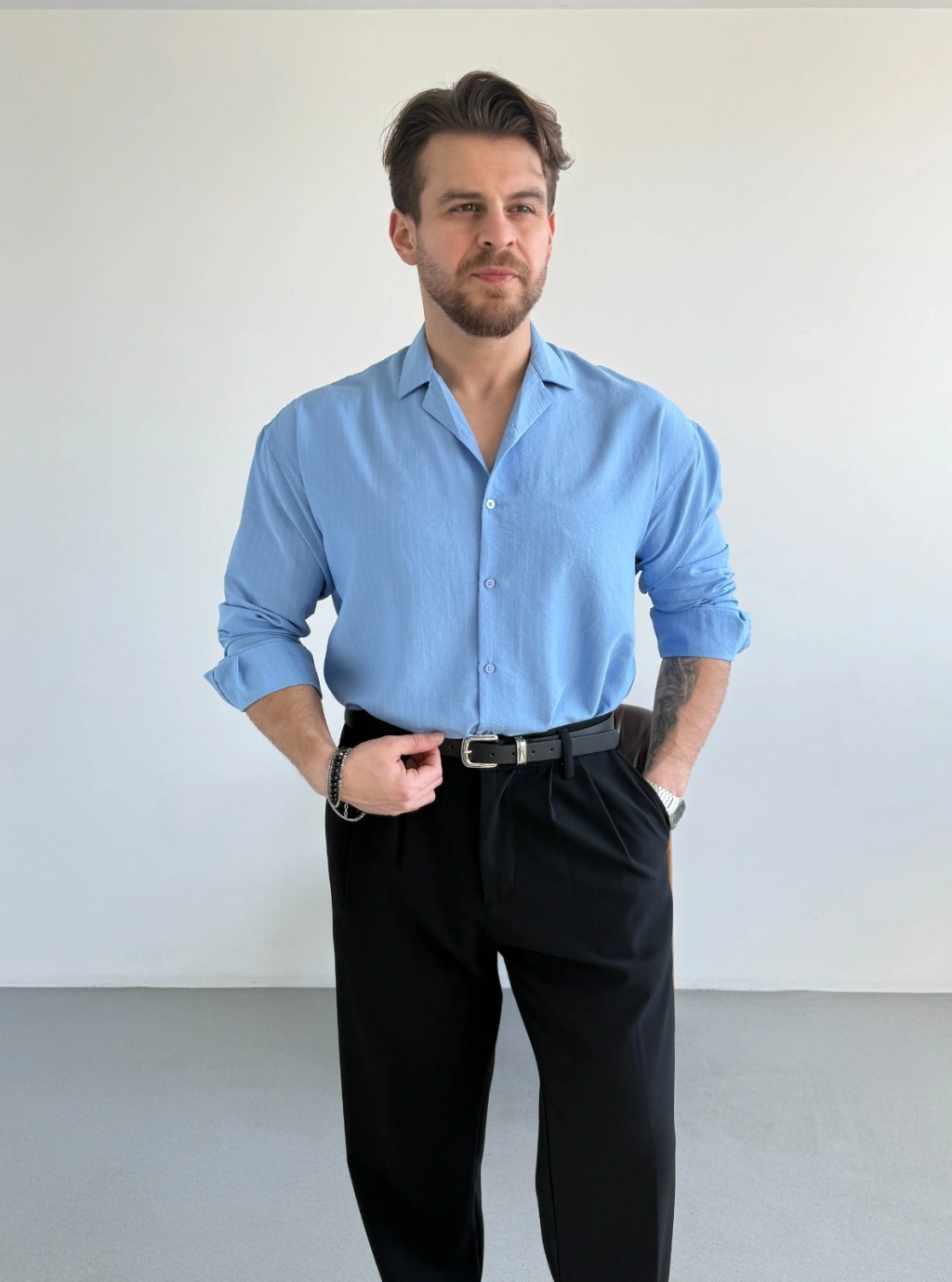 MAVİ APAŞ YAKA ÇİZGİLİ GÖMLEK