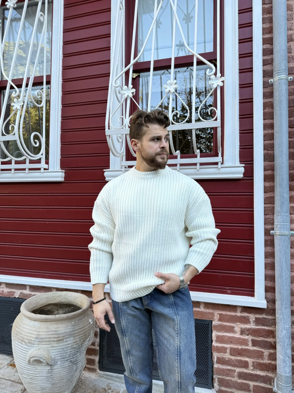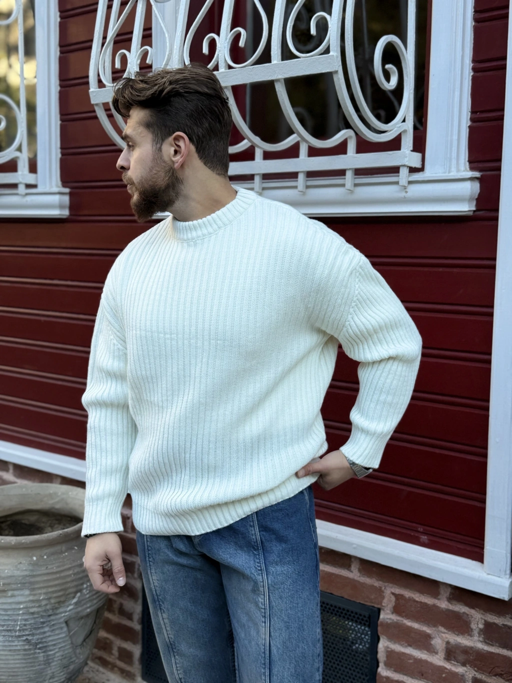 Oversize Kalıp Kalın Fitilli Kazak Beyaz