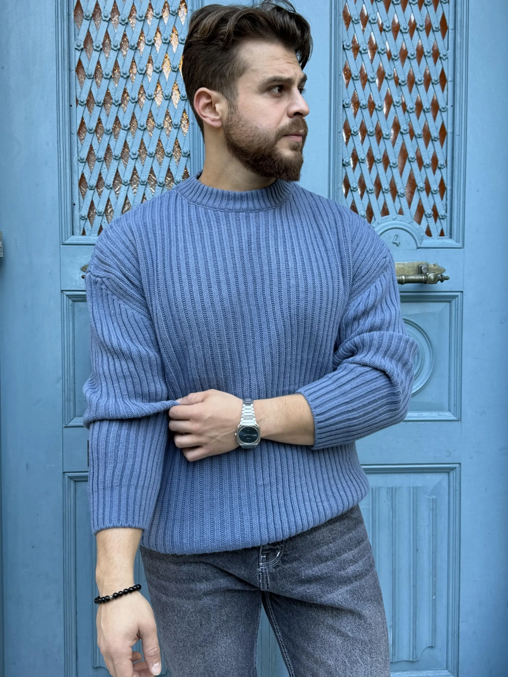 Oversize Kalıp Kalın Fitilli Kazak İndigo