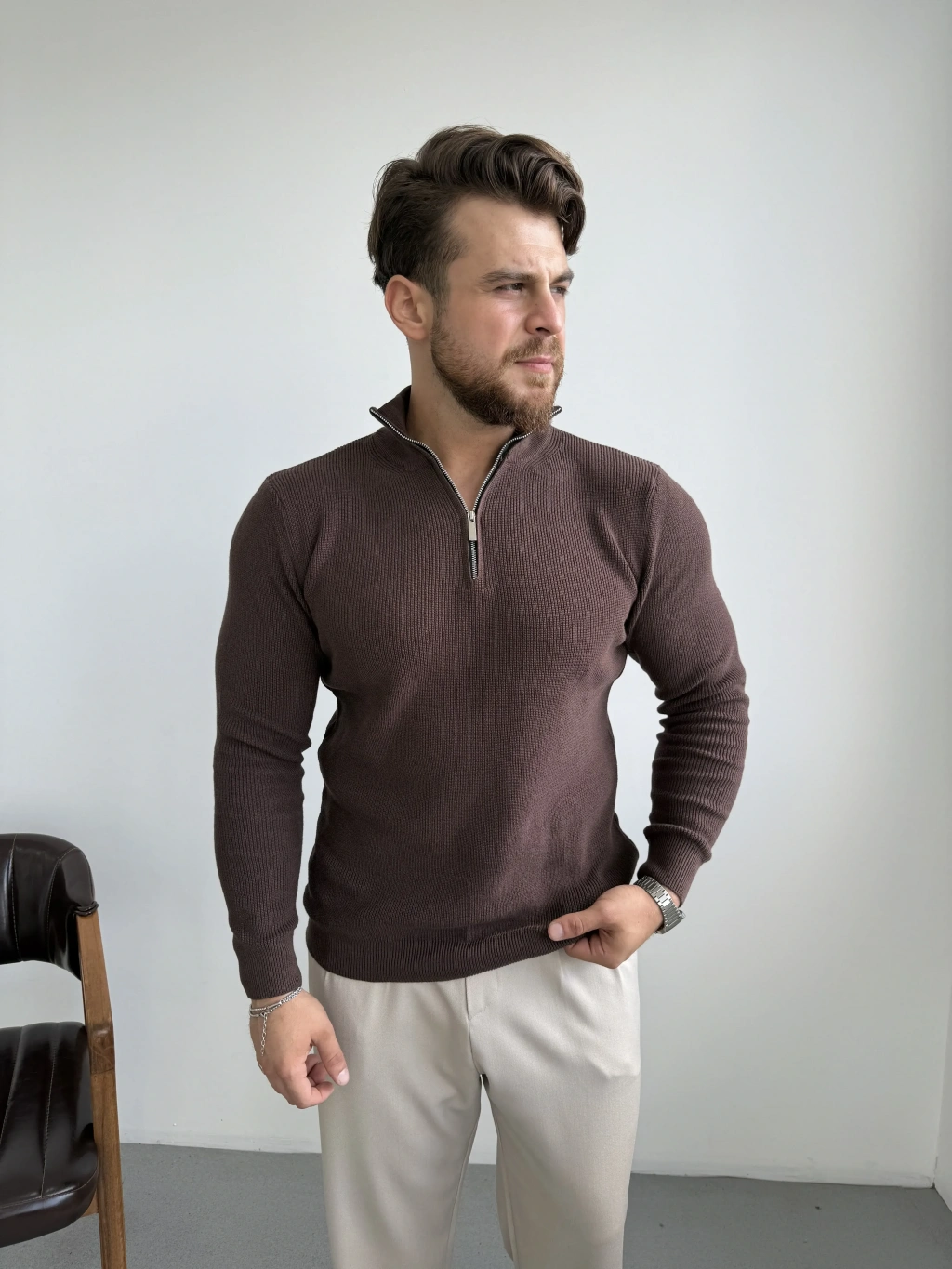 Yarım Fermuar Yaka Triko Kazak Kahve