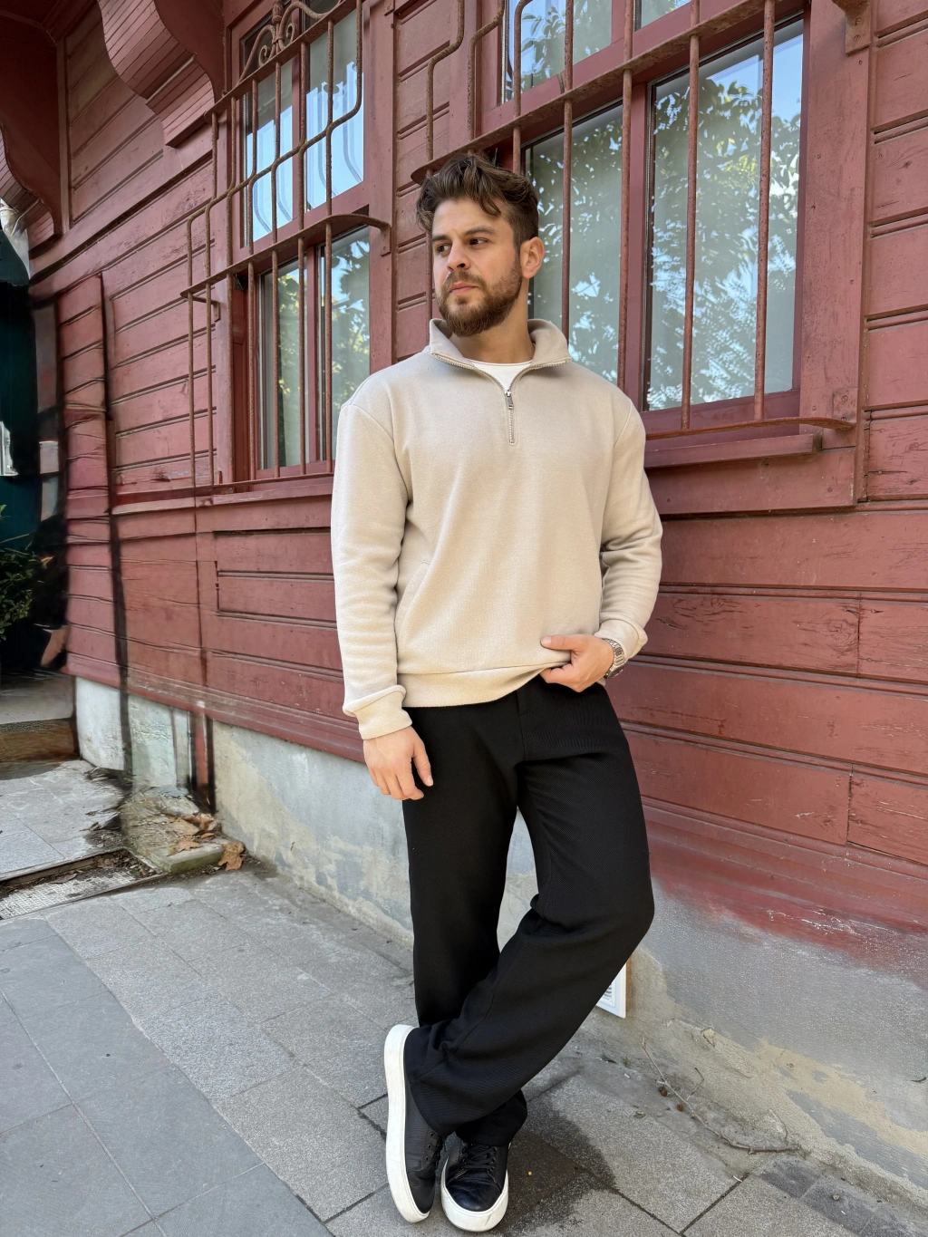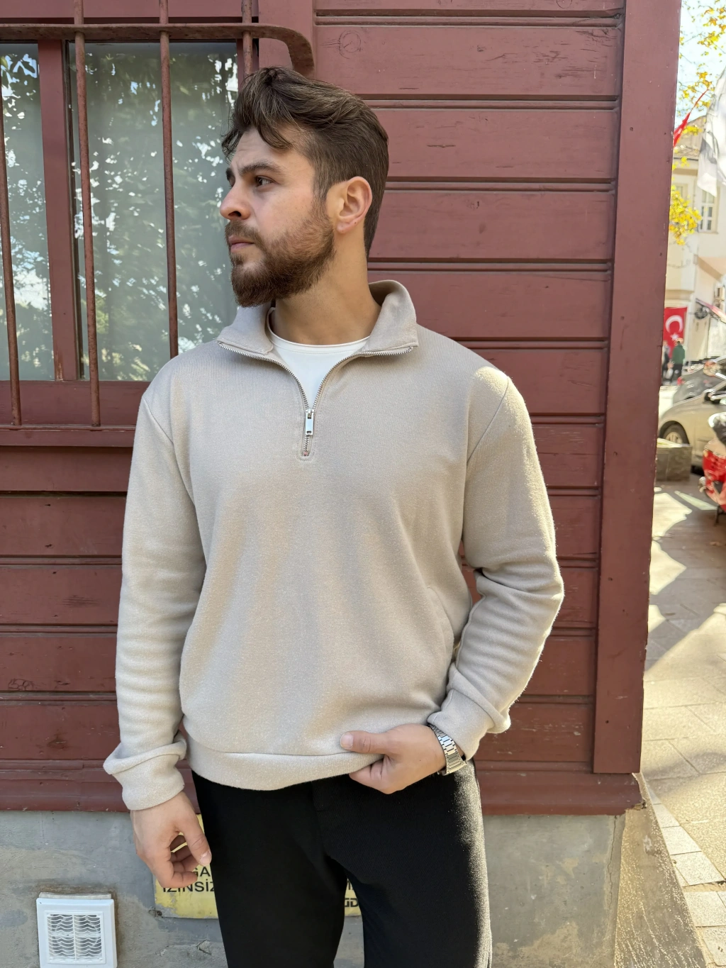 Yarım Fermuarlı Dik Yaka Sweat Bej