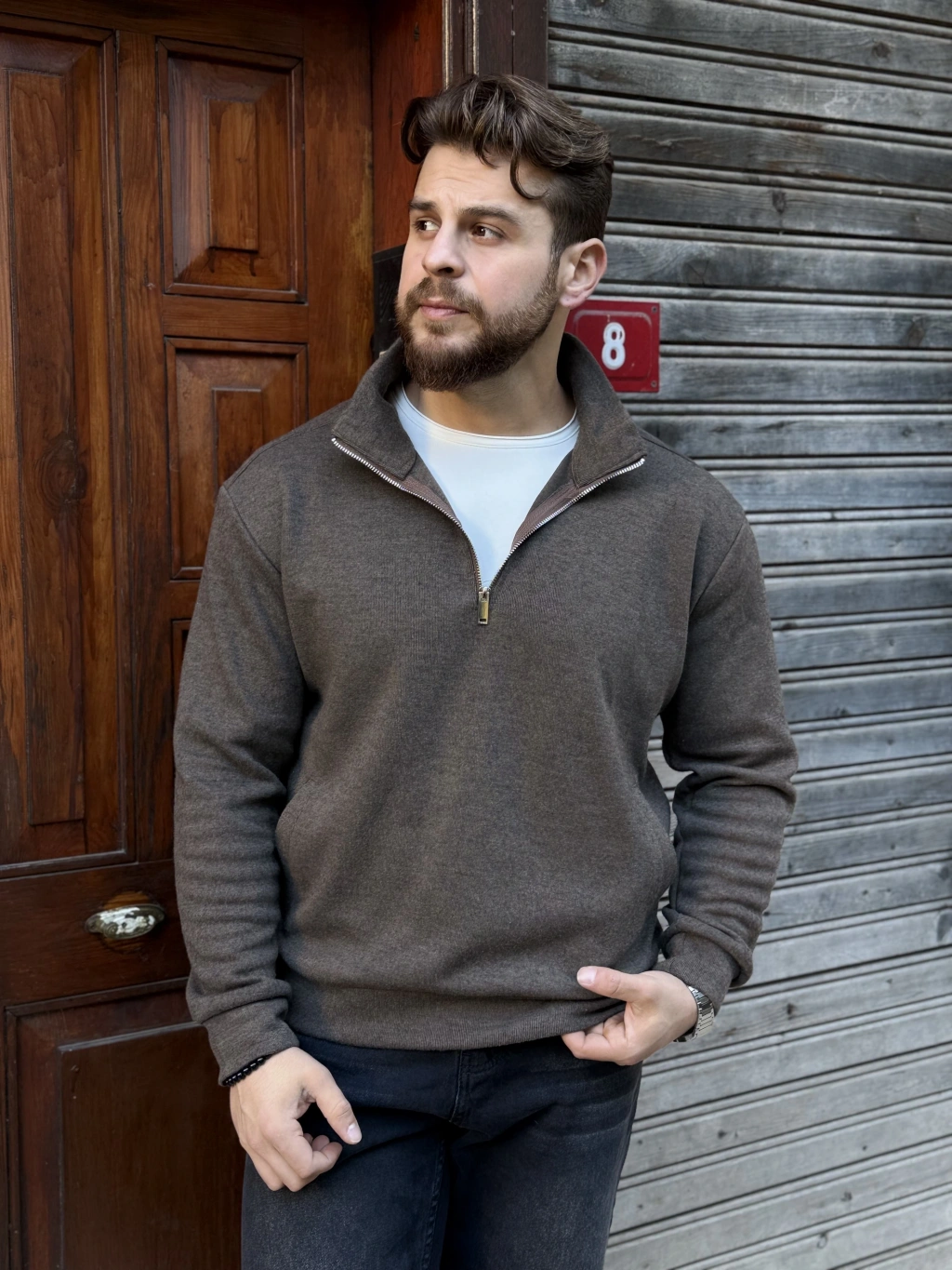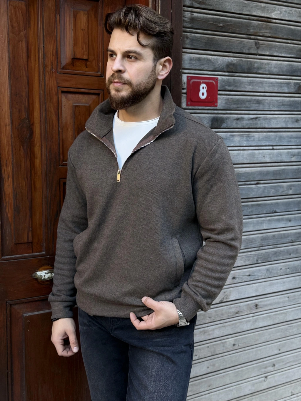 Yarım Fermuarlı Dik Yaka Sweat Kahverengi